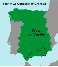 摩里斯科时期的卡斯提尔王室领地,黑线部分是最后吞并的格拉纳达