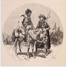 《堂吉诃德》一书中的插画,描绘了骑马的桑丘与旧友,摩里斯科人里科特相遇的场景